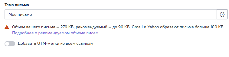 В случае, если содержание письма будет весить больше 90 кБ, мы предупредим вас об этом: