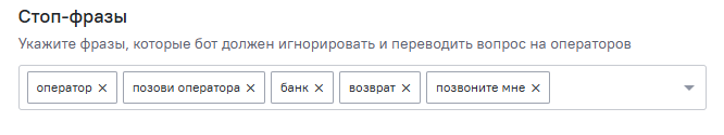Здесь можно задать стоп-фразы: если пользователь в общении с ботом использует заданное слово, бот переведет вопрос на оператора.