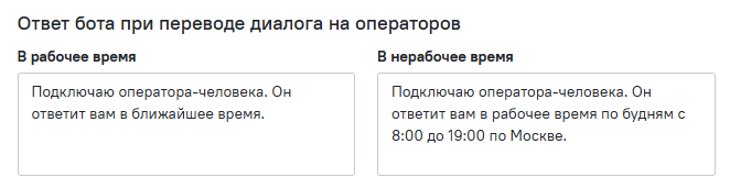 Также вы можете указать вариант ответа бота для рабочего/нерабочего времени. Ответ будет отправляться при переводе диалога на оператора.
