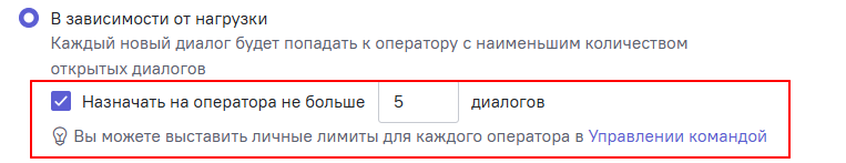 В этом варианте распределения также есть возможность ограничить максимальное число диалогов для каждого сотрудника. Например, если в команде есть новичок, которому пока сложно обрабатывать много запросов, для него можно поставить своё ограничение (в настройках карточки сотрудника в Управлении командой). Оно также пригодится, чтобы операторы могли сосредоточиться на уже назначенных диалогах, обрабатывая их постепенно.