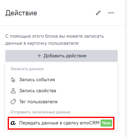Используйте блок «Действие», чтобы записать событие, свойство и тег в карточку пользователя. Это произойдёт в момент, когда пользователь перейдёт в блок, перед которым размещено Действие.