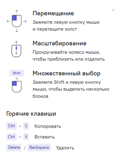 Вы можете перемещать холст, масштабировать его, а также выбирать сразу несколько блоков цепочки, копировать, вставлять и удалять их: