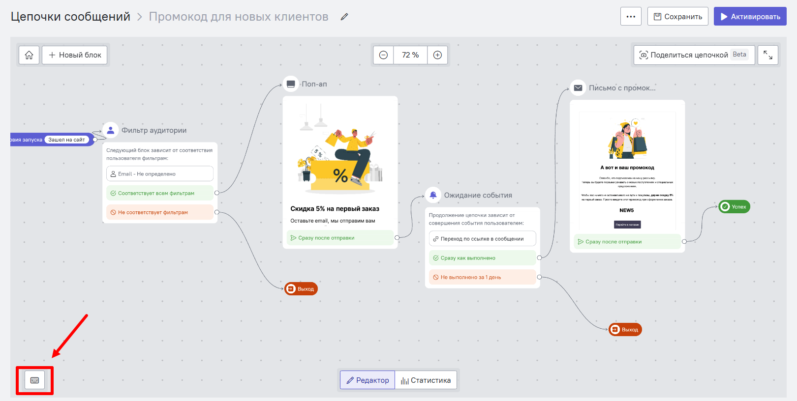 Для удобства при работе с цепочками вы можете использовать горячие клавиши - открыть меню можно по кнопке слева внизу: