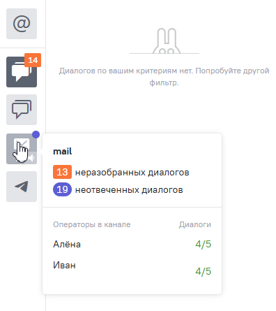 При наведении курсора на иконку канала вы увидите число неразобранных и неотвеченных диалогов. Если к проекту подключен модуль "Оптимизируй поддержку" - также можно будет просмотреть список операторов, имеющих доступ в канал: