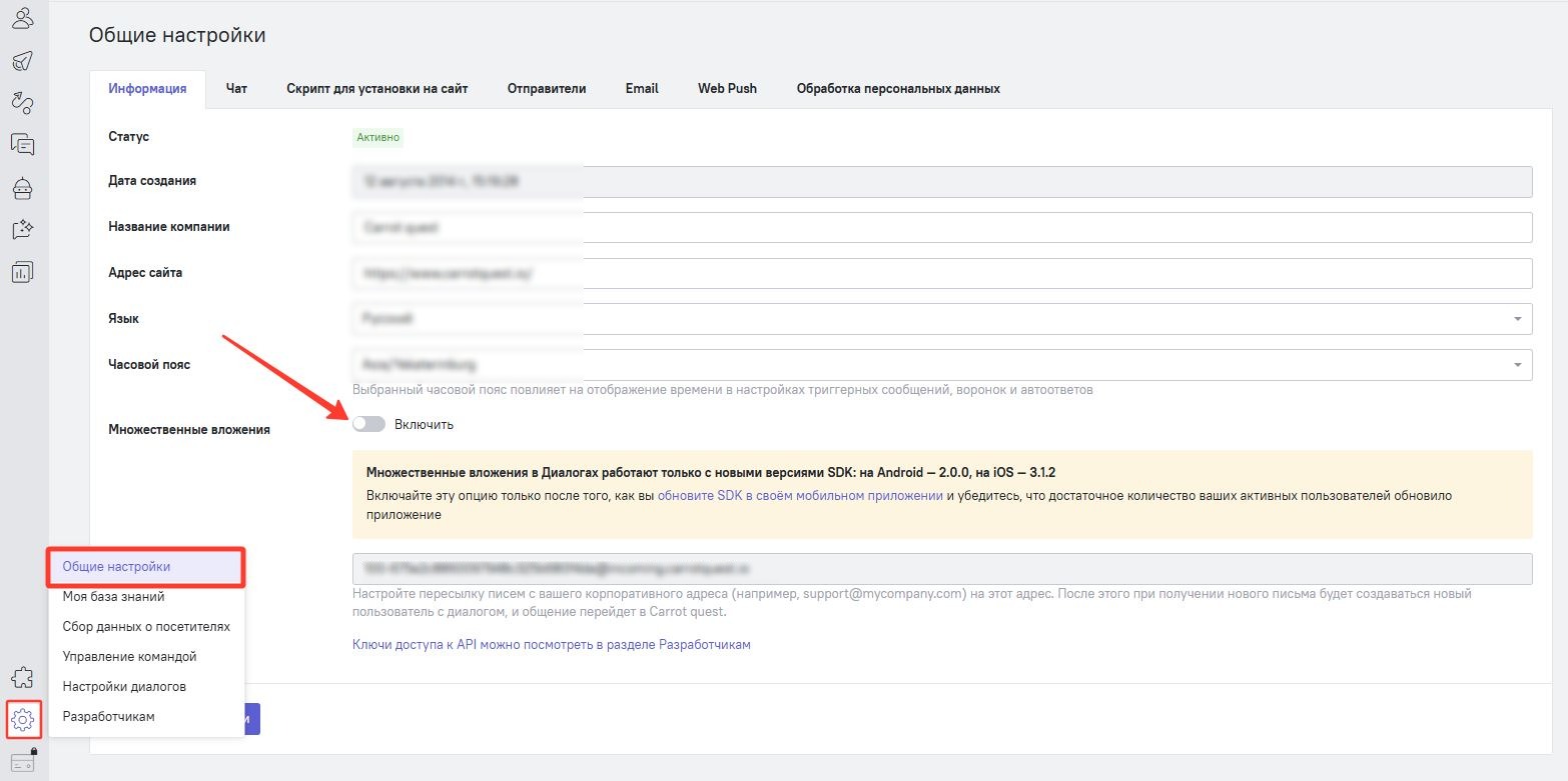 Обратите внимание: если вы используете SDK, то прикрепление множественных файлов в проекте можно активировать в разделе "Общие настройки". Предварительно убедитесь, что ваш SDK обновлен до актуальной версии.