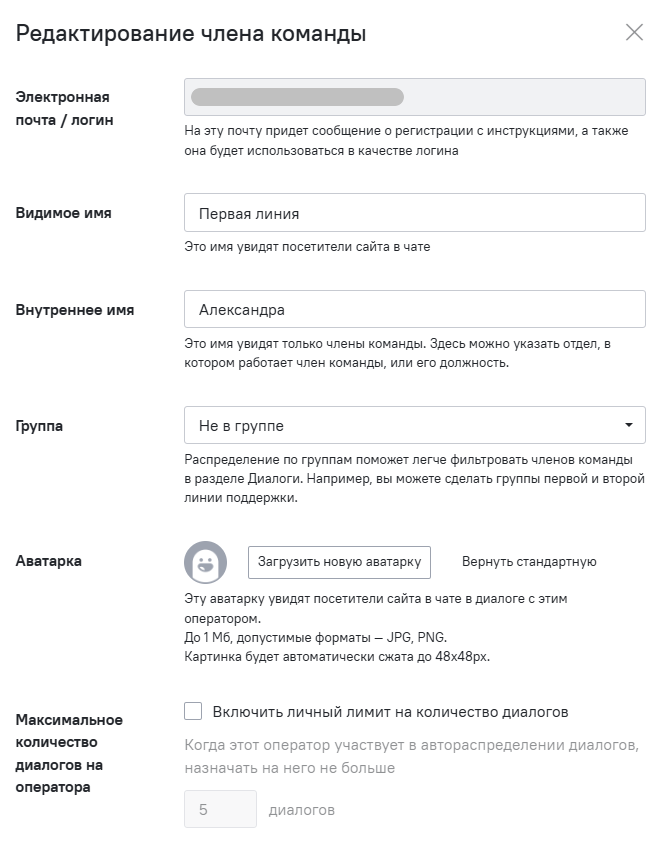 Добавление новых операторов займёт всего пару минут. Добавить пользователя можно через раздел "Настройки" - "Управление командой", там нажмите на "Добавить члена команды".