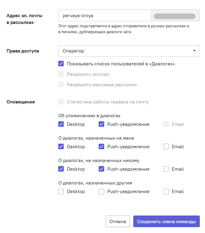 Укажите роль, email, дайте разрешение на экспорт лидов, массовые рассылки или на просмотр списка пользователей в "Диалогах", и отправьте приглашение. Обратите внимание, что приглашение действительно только в течение 24 часов.