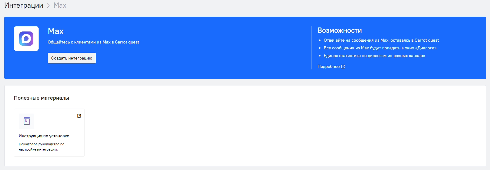 1. В разделе "Интеграции" создайте новую интеграцию с MAX.