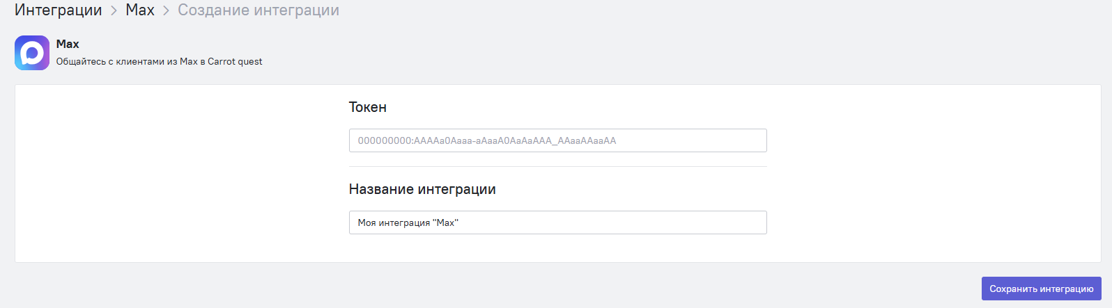 2. Укажите название интеграции и введите токен, полученный в настройках вашего бота в MAX: