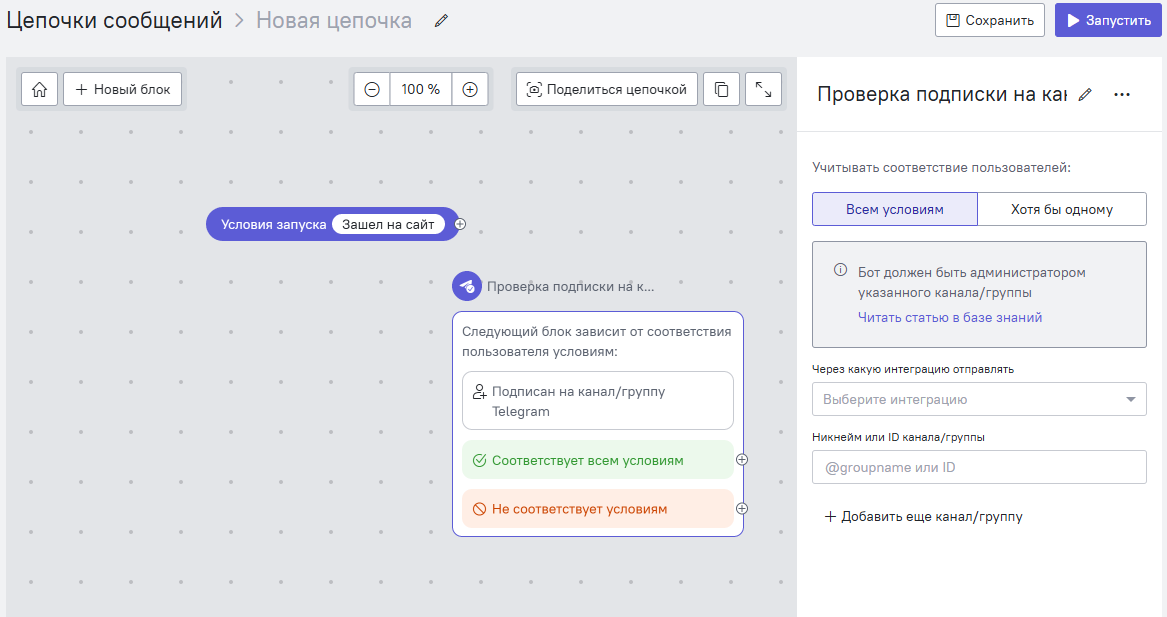 В блоке можно также выбрать тип соответствия - “Всем условиям” или “Хотя бы одному” (если вы проверяете подписку на несколько групп/каналов).