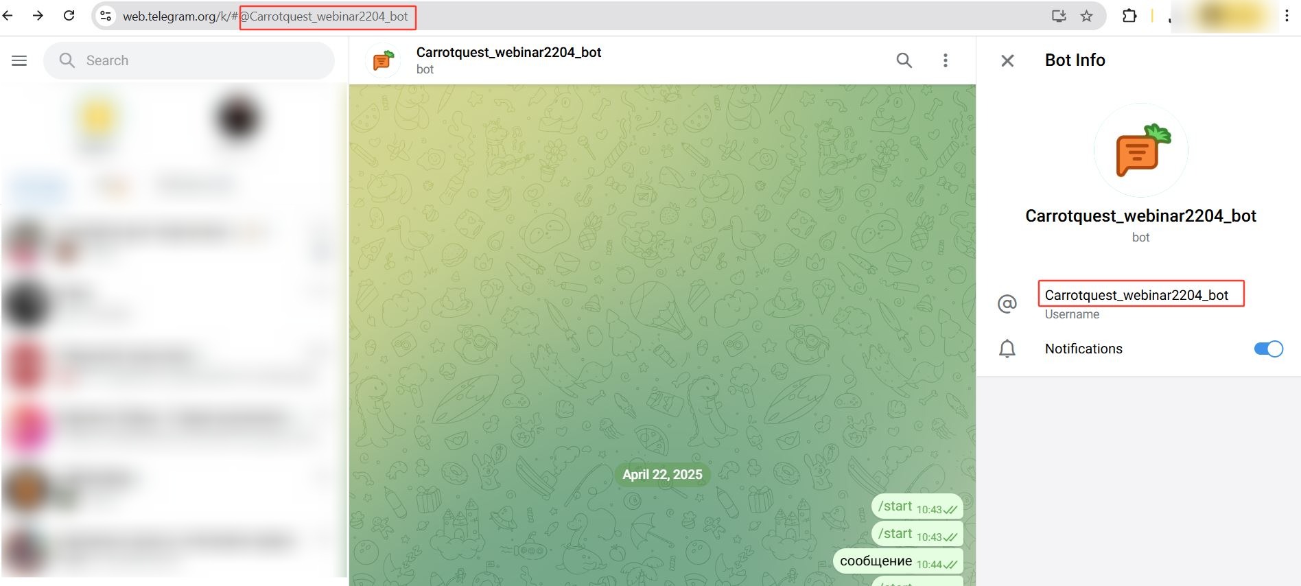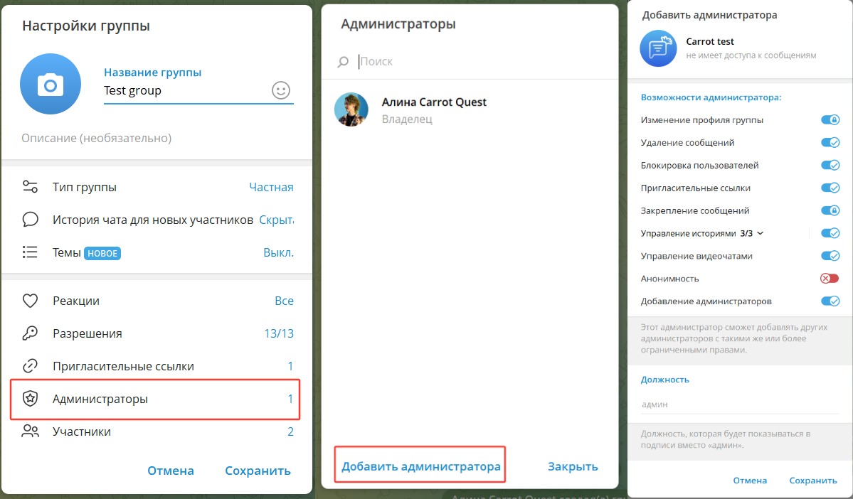 Бот из выбранной интеграции обязательно должен быть добавлен в группу/канал как администратор.